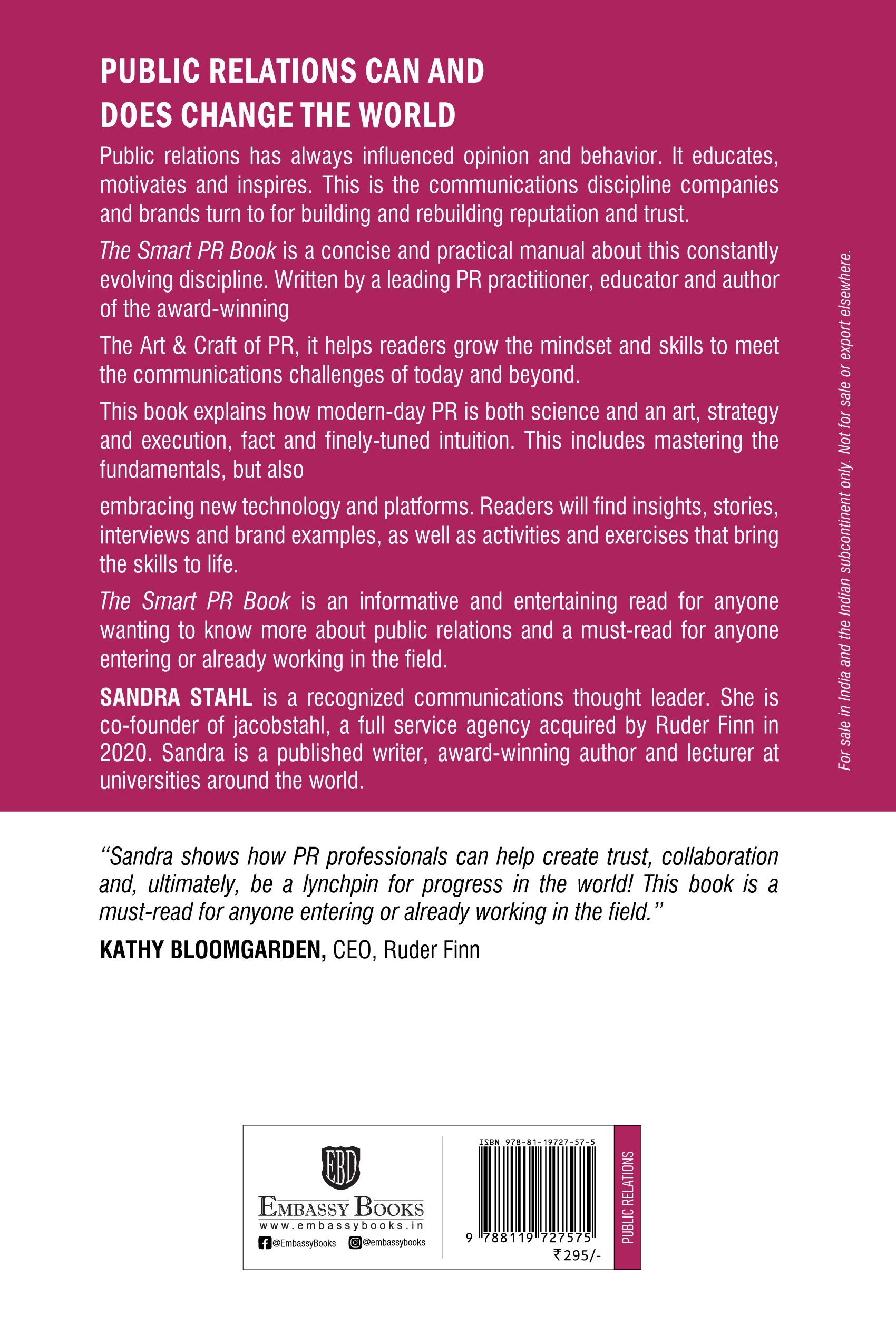 Public relations has always influenced opinion and behavior. It educates, motivates and inspires. This is the communications discipline companies and brands turn to for building and rebuilding reputation and trust. The Smart PR Book is a concise and practical manual about this constantly evolving discipline.